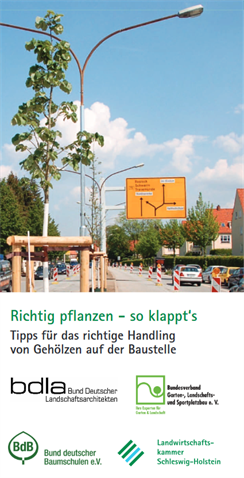 Der Flyer enthält in Form einer kurzen Bedienungsanleitung viele praktische Tipps und bebilderte Hinweise für den fachgerechten Umgang mit Gehölzen entsprechend der normativen Vorgaben gemäß DIN 18916 „Pflanzen und Pflanzarbeiten“ und der „FLL-Empfehlungen für Baumpflanzungen“. Enthalten sind unter anderem Regelungen zu Transport, Entladen und Lagern auf der Baustelle, Pflanzenschnitt, Wurzelschnitt, Pflanzlochausbildung, Herstellen des Gießrandes, Anwässern, Düngen und Leistungen der Fertigstellungspflege, insbesondere Wässern.