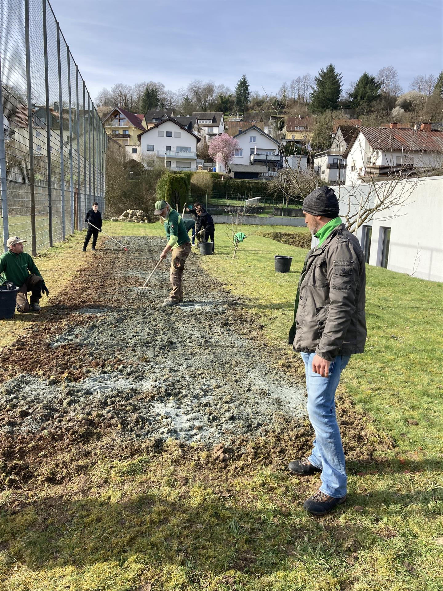 Eine Wildblumenwiese ensteht an der Weiltalschule Weilmünster mit GF Markus Langer, Mario und Patrick„Als ich von der Aktion des FGL erfahren habe, dachte ich sofort ‚das ist etwas für uns‘. Also haben wir uns beworben und waren erfolgreich“, erklärte Julia Agafonow, Lehrerin an der Weiltalschule. Die Schülerinnen und Schüler der Abschlussklassen pflegen eine langjährige Tradition, indem sie auf der schuleigenen Streuobstwiese einen Obstbaum pflanzen. Die kürzlich entstandene Blühwiese in unmittelbarer Nähe erfüllt nun eine neue Funktion: Sie trägt zur Steigerung der Biodiversität bei und fungiert als Anziehungspunkt sowie Nahrungsquelle für Bienen und andere bestäubende Insekten.