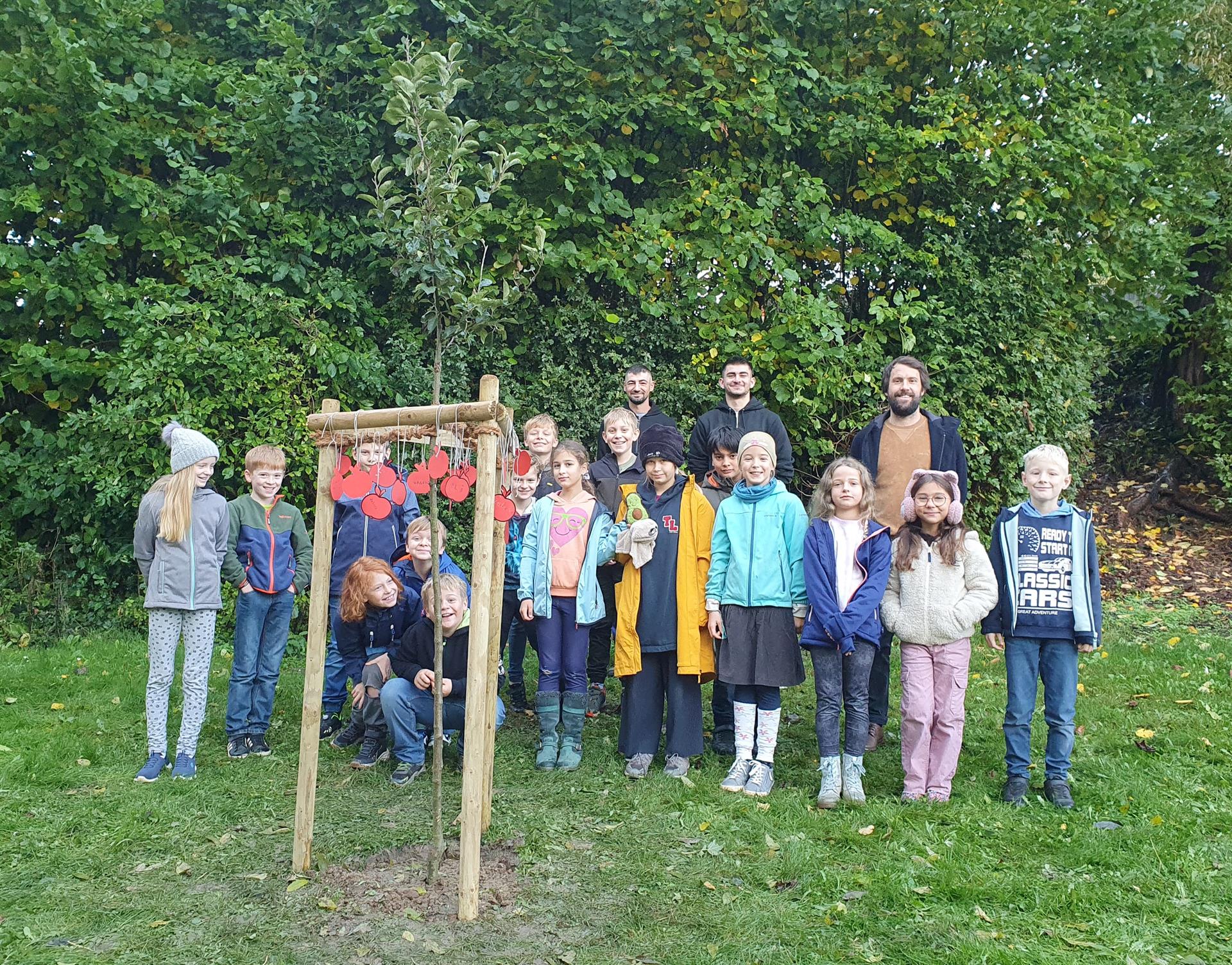 Das Team von Eder Garten- und Landschaftsbau mit Kindern der Grundschule Amöneburg. Am neu gepflanzten Apfelbaum hängen selbst gestaltete Äpfel der Kinder mit ihren Wünschen für die Zukunft.Die Klasse 3 des Jahrgangs 2023 bewarb sich mit einem kreativen Bild und dem Wunsch, einen Apfelbaum zu pflanzen, an dem später eine Schaukel angebracht werden könnte. Der Baum wurde hinter dem roten Fußballfeld platziert und dient nun als natürliche Abgrenzung zur angrenzenden Straße. In Zukunft wird er nicht nur als Schattenspender dienen, sondern den Kindern auch die Möglichkeit zur Obsternte und zum spielerischen Erkunden der Natur bieten.