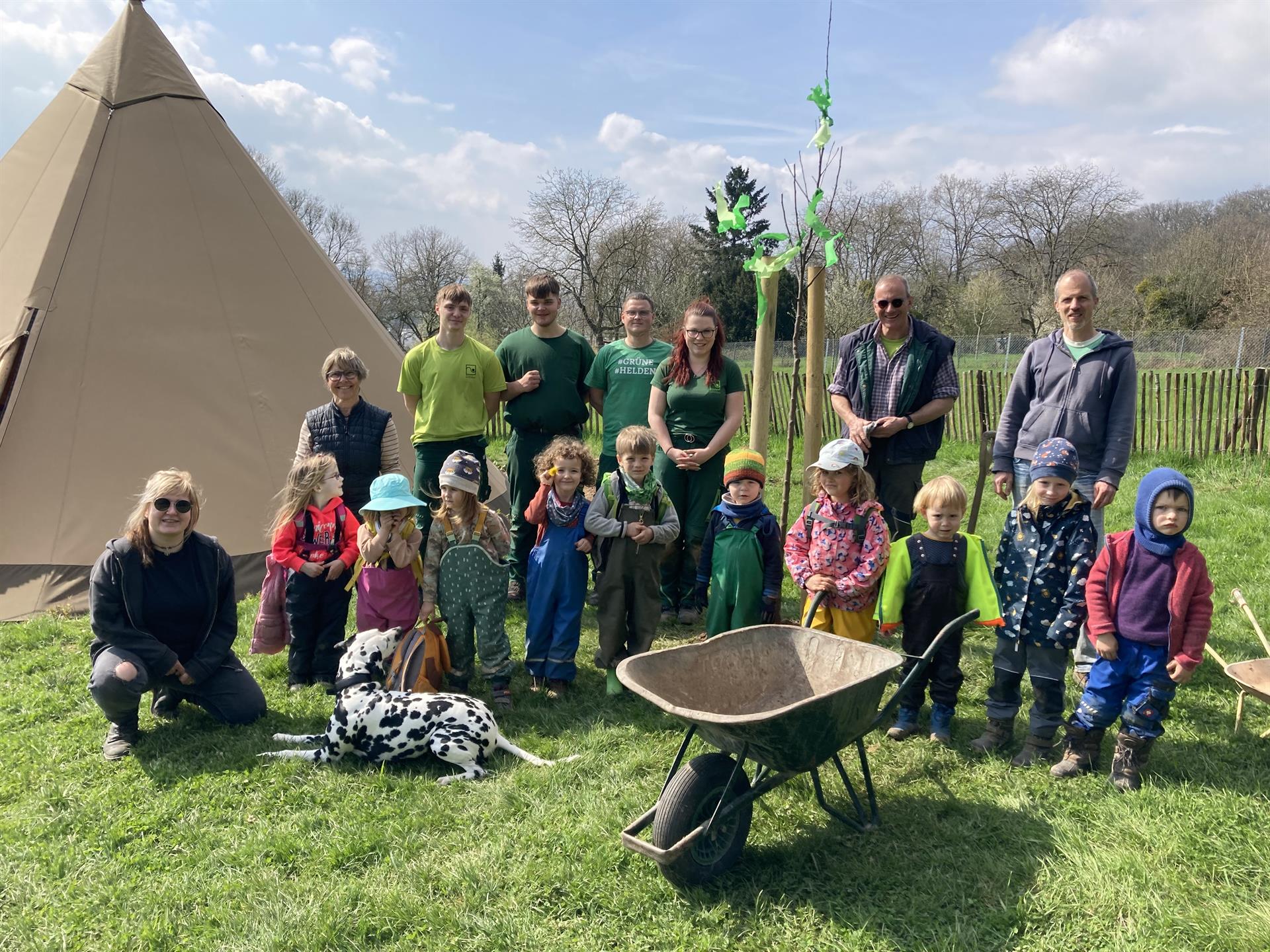 Kinder und Team des Waldorfkindergartens Gelnhausen mit Peter Sennert (2. von rechts) und dem Team von Sennert Gartengestaltung aus Obertshausen.