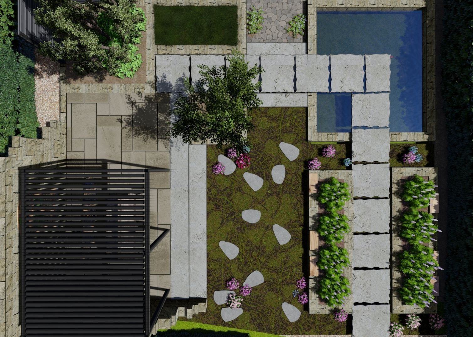 „GartenZeitRaum“ ist ein Hausgarten, der seinen Namen ganz bewusst trägt: ein Ort, an dem Zeit spürbar langsamer wird und Raum für Erholung, Schönheit und stille Momente entsteht. Schon beim Betreten entfaltet sich eine Atmosphäre, die zum Ankommen und Loslassen einlädt. Die großzügige Terrasse bildet das Herzstück des Gartens und wird durch eine markante Reb-Mauer eindrucksvoll in Szene gesetzt. Unter dem flexibel nutzbaren Pavillon lässt sich der Tag entspannt ausklingen, während ein Weg unter einer Sumpfeiche zum ruhigen Flanieren einlädt.