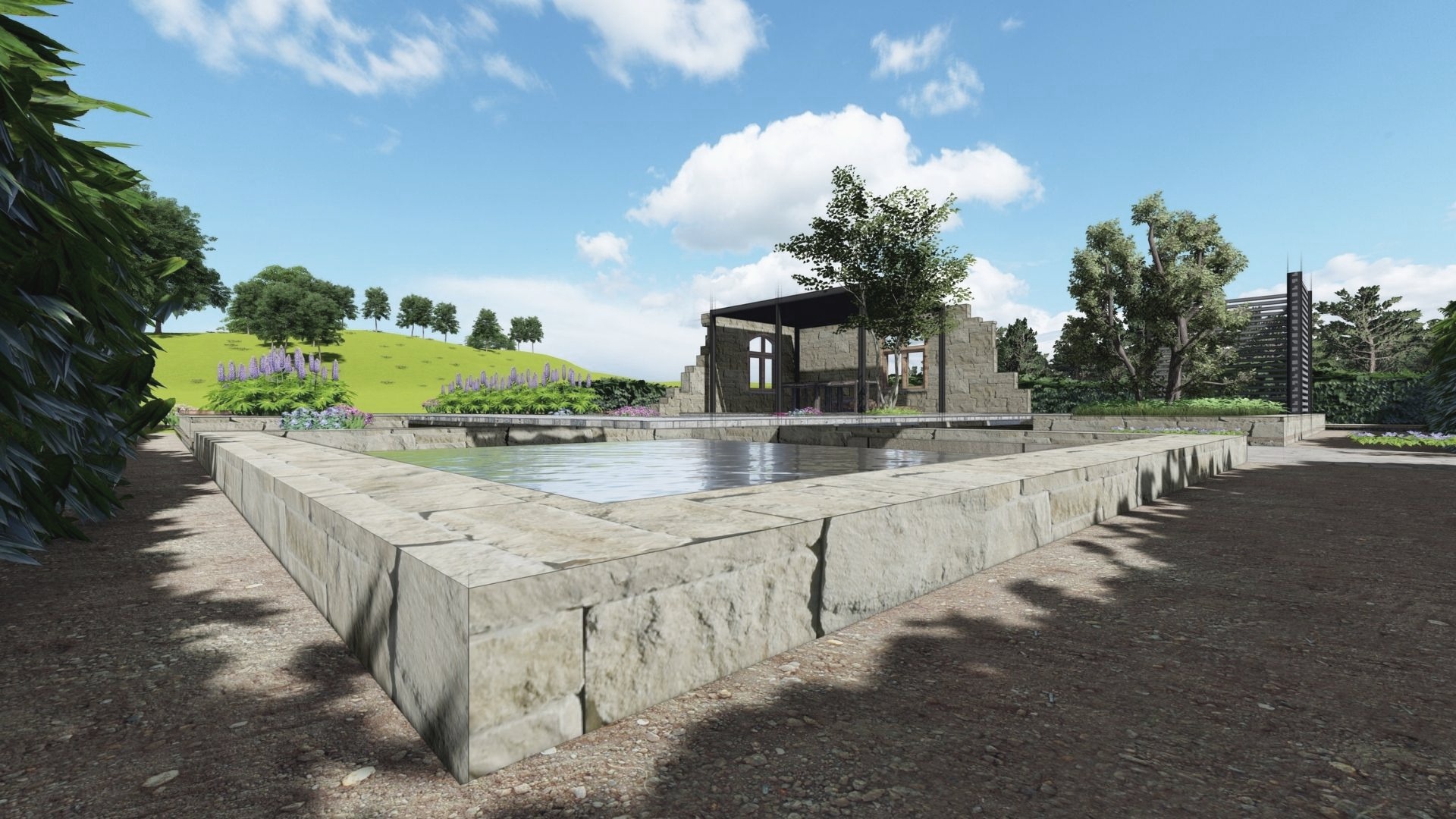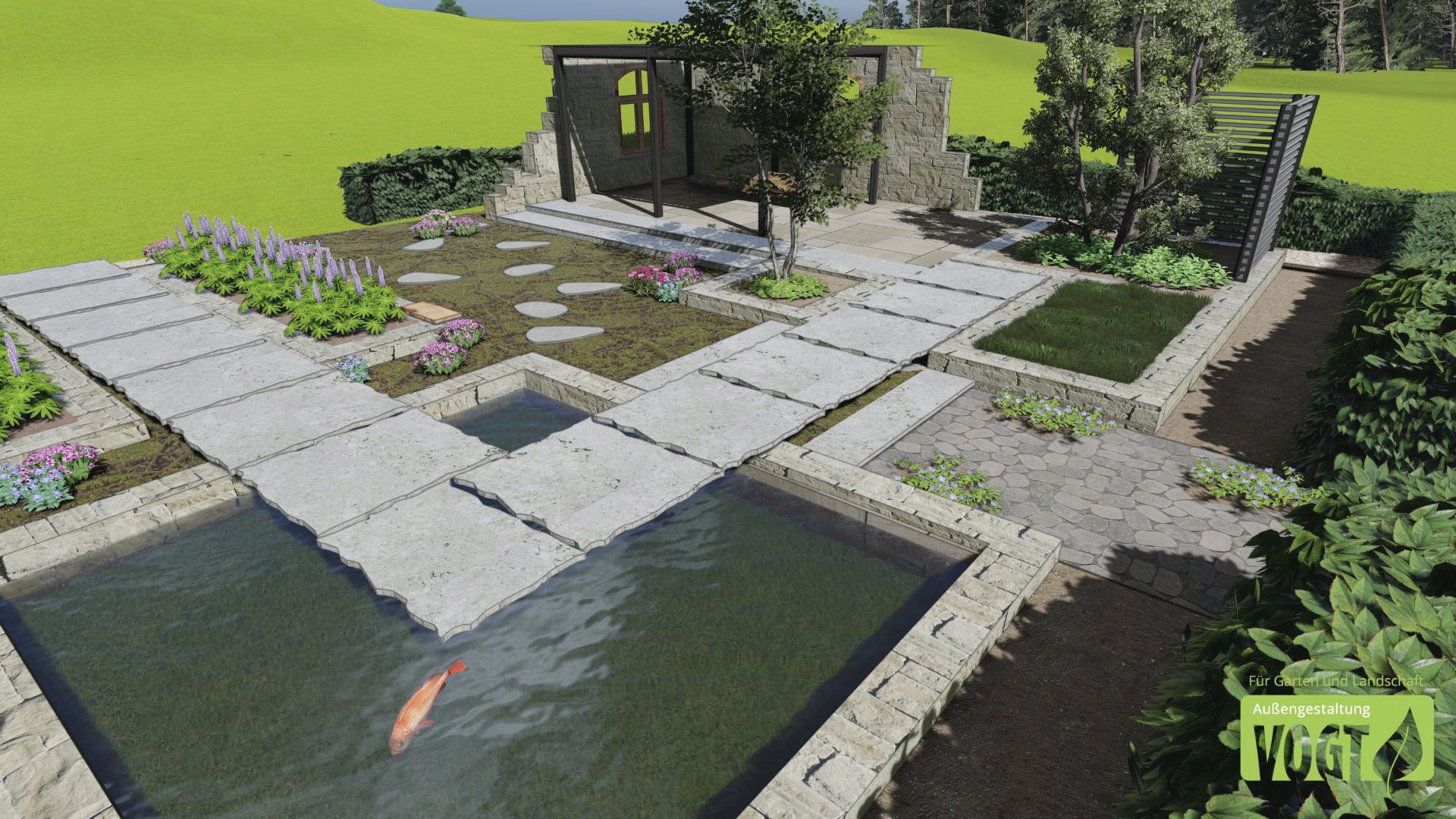 Hochwertige Materialien wie Muschelkalk, Dietfurter Kalkstein und Holz aus eigenem Wald unterstreichen den natürlichen, zugleich modernen Charakter des Gartens. Die Terrasse ist rollstuhlgerecht gestaltet und verbindet Komfort mit anspruchsvoller Gestaltung.