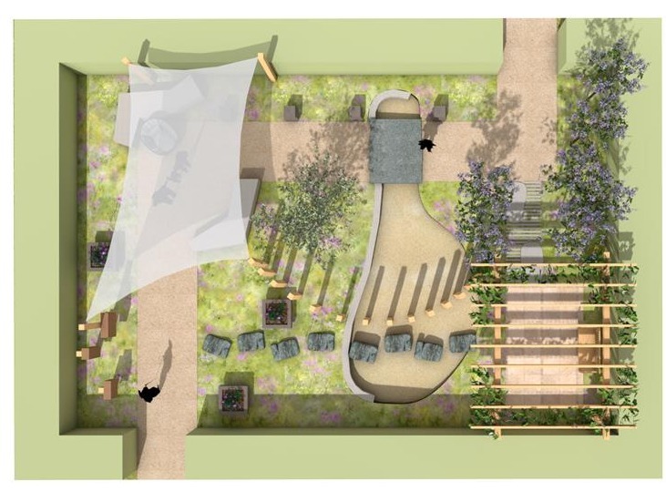 Ein kleines Wäldchen aus Blauglockenbäumen bringt Schatten und räumliche Fassung in die Anlage. Ergänzt wird es durch ausgewählte Gehölze wie Apfelquitte, Grannenkiefer und Blumenhartriegel, die den Garten zusätzlich gliedern und bereichern.